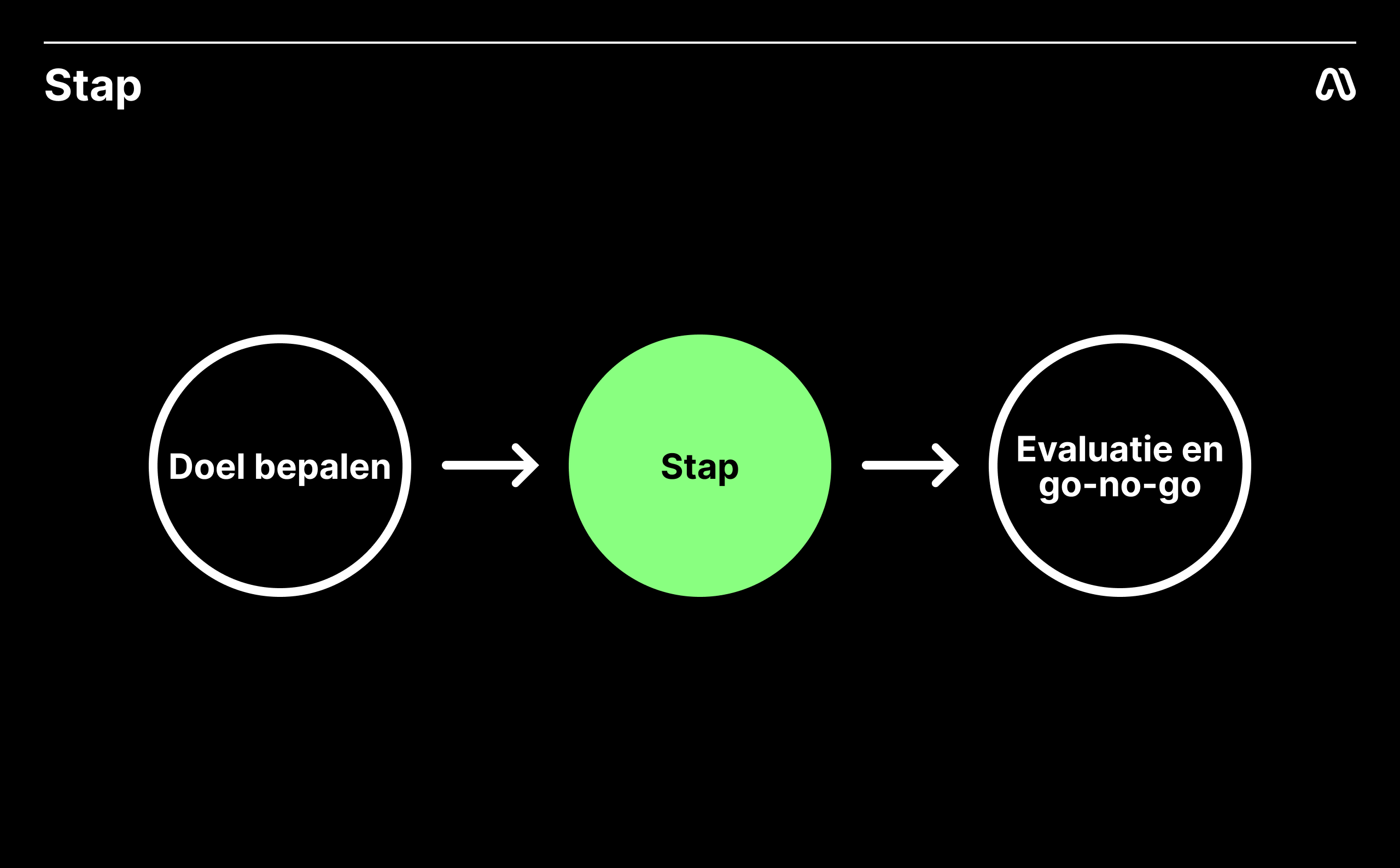 Iedere stap in een fase duurt ongeveer een week. Voorafgaand aan iedere stap bepalen we het doel van de stap, op basis van de inzichten uit de vorige stap. Na een week beoordelen we het resultaat van de stap. Dit is ook altijd een go-no-go moment. Gaan we verder? En zo ja, met welke stap? Gaan we door naar de volgende stap? Willen we nog meer verdiepen in dezelfde stap? Of willen we meer inzicht krijgen door juist een stapje terug te doen?