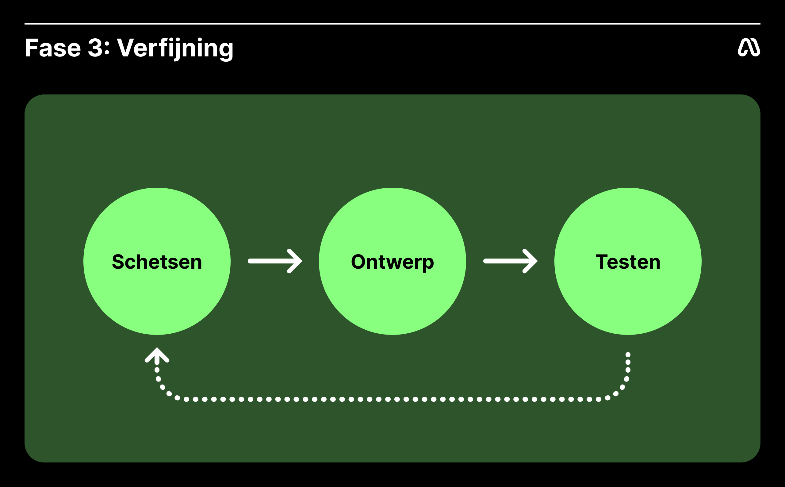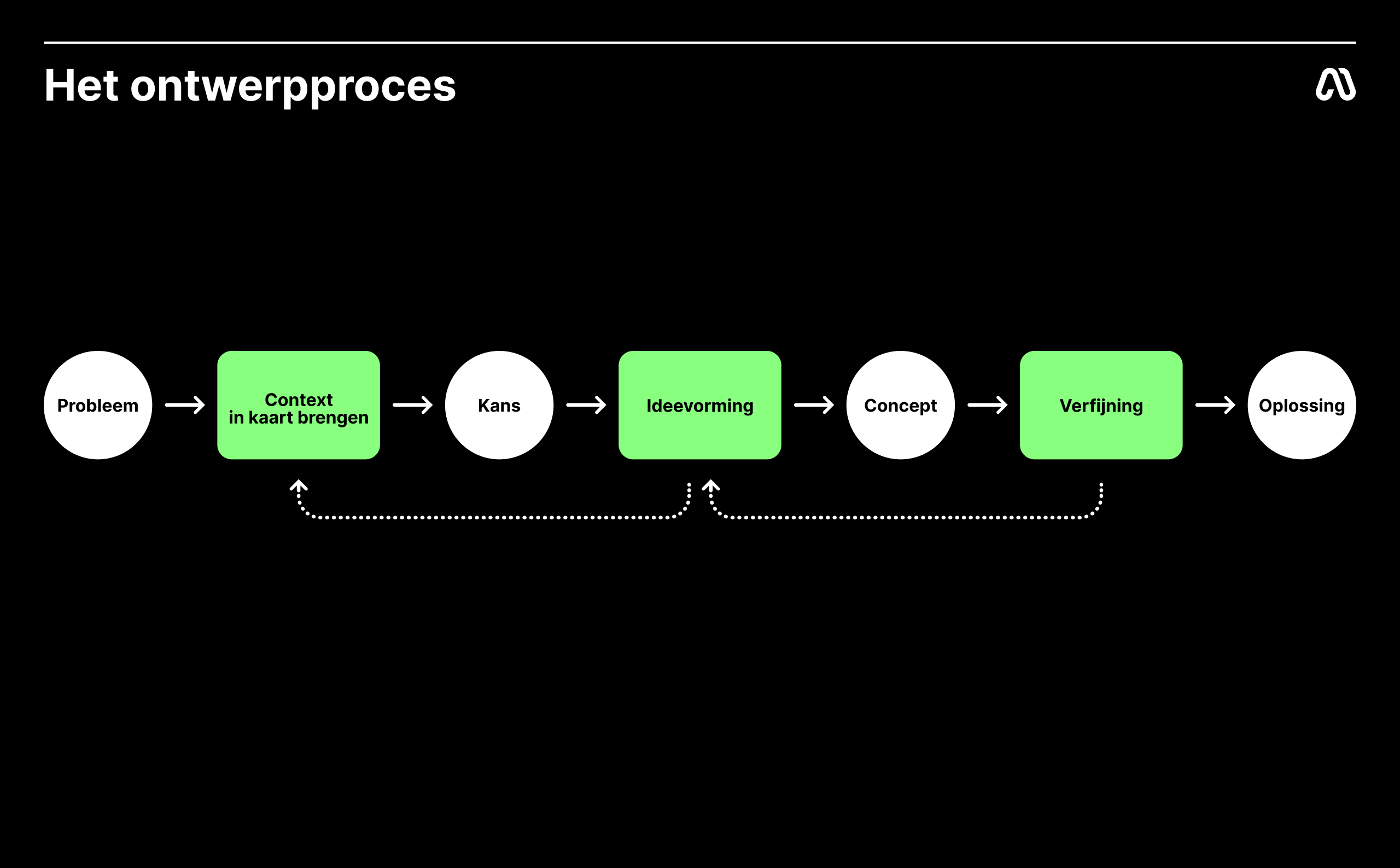 Voor de overzichtelijkheid presenteer ik het ontwerpproces in dit verhaal tot nu toe vooral als een rechtlijnig proces. In de praktijk is het dat niet. Het is juist een iteratief proces waarin we regelmatig een stapje terug doen naar een eerdere fase in het proces. Dat zijn dus die gestippelde pijlen.