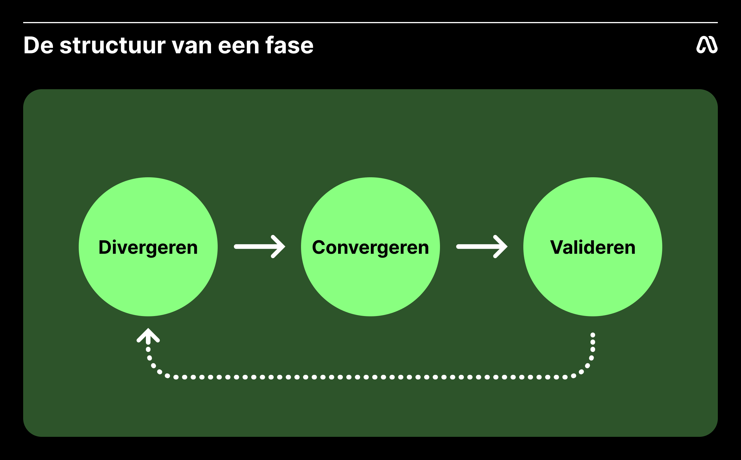 Deze 3 fasen leiden ons van het probleem, via de kans en het concept, naar de oplossing.