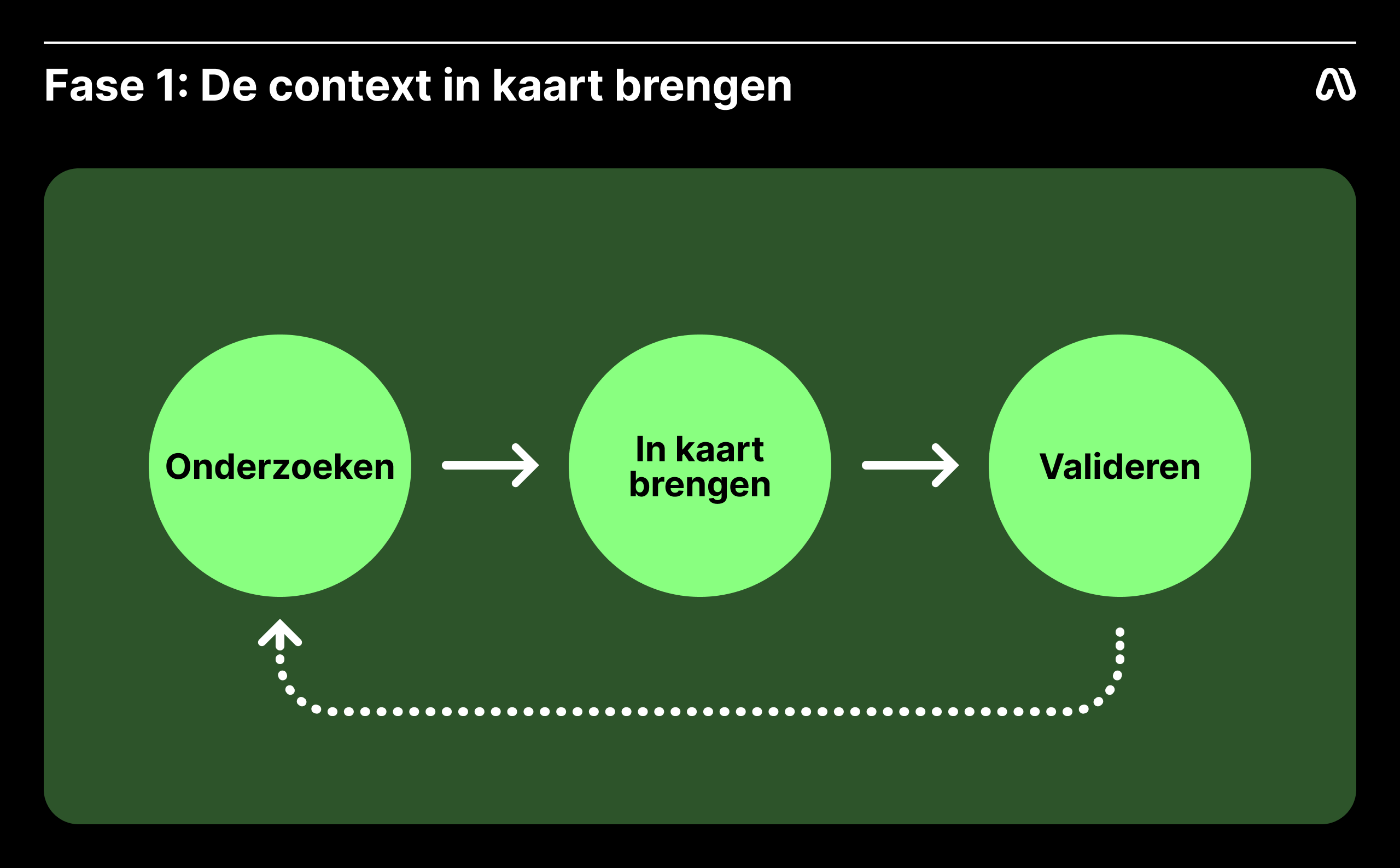 Tijdens het valideren bespreek ik het beeld van de context met diverse stakeholders. Zo wordt duidelijk of wat ik in kaart gebracht heb klopt, en of het compleet genoeg is om naar de volgende stap in het proces te gaan.