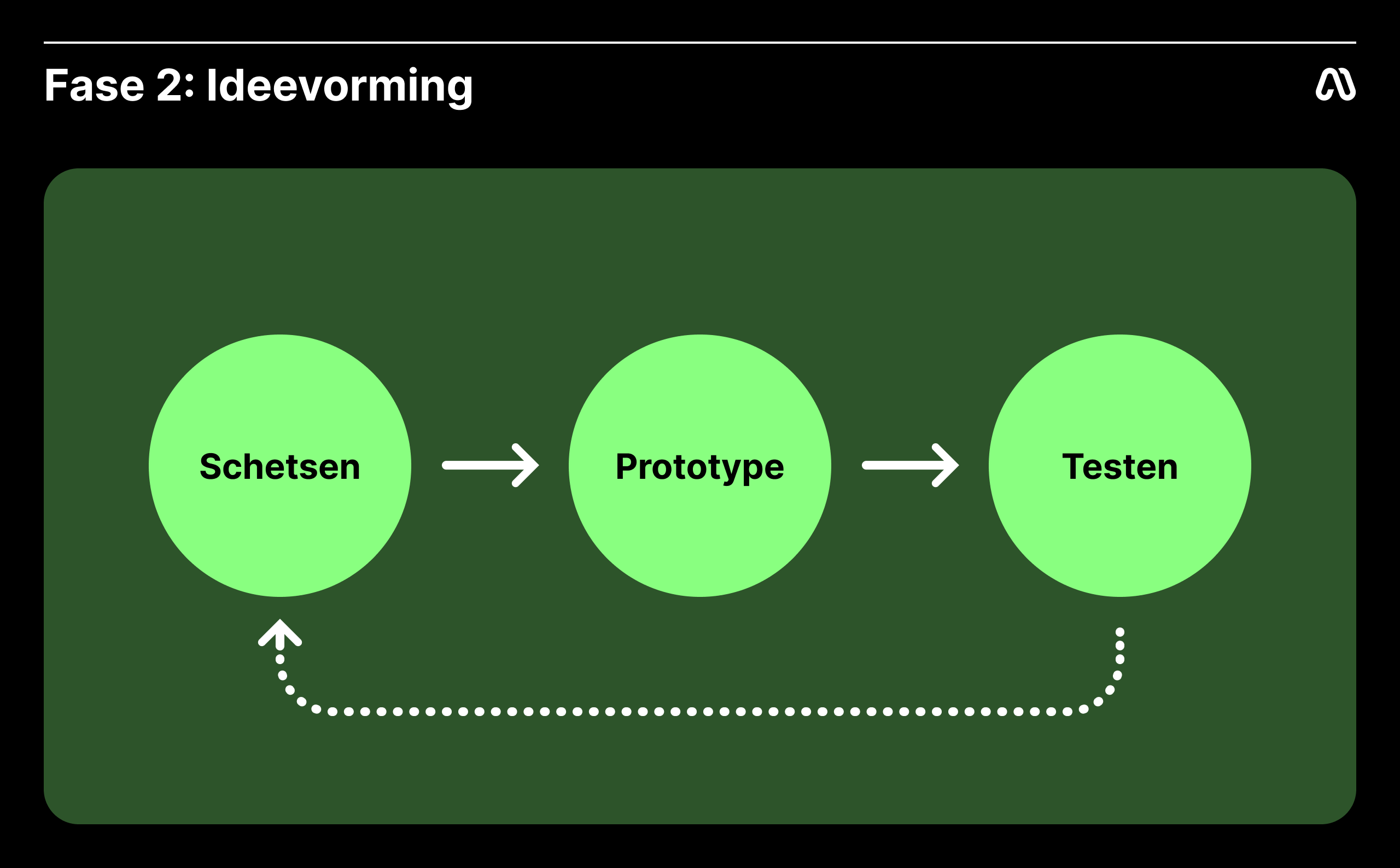 Op basis van de benoemde kansen begin ik met schetsen. Ik bedenk allerlei verschillende manieren om het probleem op te lossen. Zo ontstaat er een breed beeld, en wordt ook buiten de gebaande paden gekeken. Vervolgens combineer ik de schetsen die het meest kansrijk lijken tot een prototype. Dit prototype test ik met eindgebruikers uit de doelgroep. Zo leren we of onze aannames kloppen, of de eindgebruikers het ontwerp begrijpen en waarderen, of de gekozen oplossing werkt, en wat de verbeterpunten zijn.